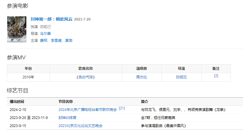 2023年,主演的神話史詩(shī)電影《封神第一部:朝歌風(fēng)云》在中國(guó)大陸上映。